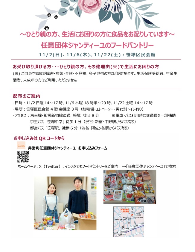 ひとり親(シングルマザー・ファザー)や障害・病気などで生活にお困りの方を対象として、東京渋谷区にて食品の配布を行っています。