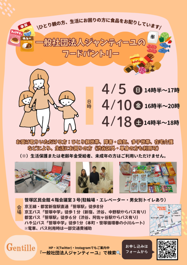 ひとり親、障害・病気、多子世帯、介護などの理由で生活にお困りの方を対象とした食品の無償配布を東京渋谷区で行っています。渋谷区外など遠方の方にも安心してご利用頂くため、交通費の一部補助もございます。